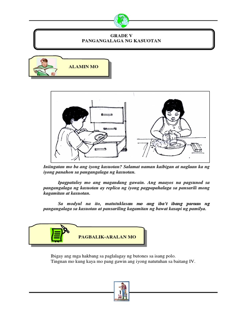 Pangangalaga sa kasuotan grade 5. Sulsihin lilipan otahini kaagad bago labhan ang mga sirang kasuotan. To play this quiz please finish editing it. Edukasyong Pantahanan at Pangkabuhayan 5 Home Economics Modyul 1.